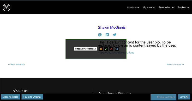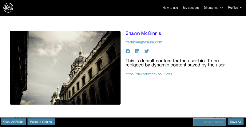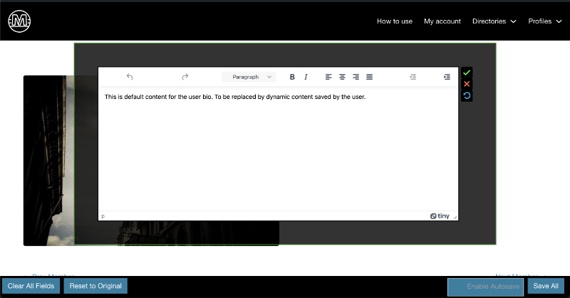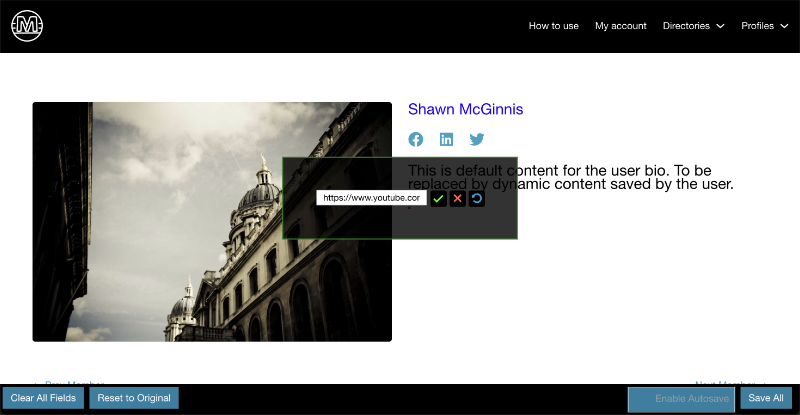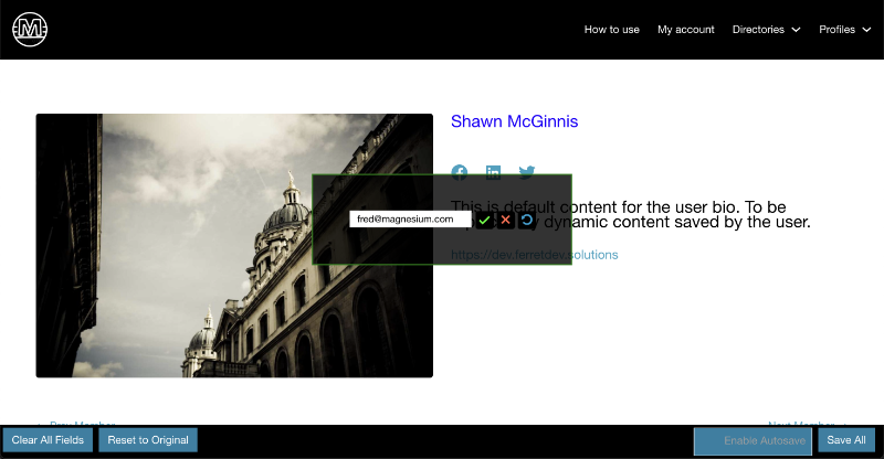 Profile Templates SimplifiedThe editable_user_meta shortcode is a versatile tool designed to display a dynamic and customizable element for front end profile data input and admin level page layouts. Inject the shortcode into any part of your page layout and change that page into a dynamic profile page template.
